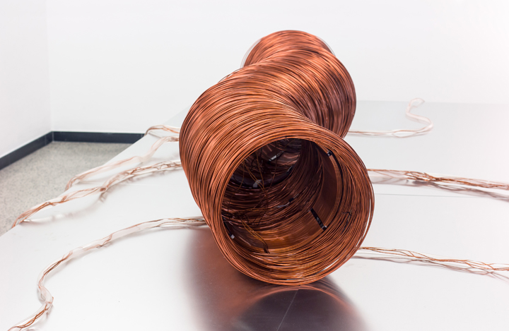Liebl und Schmid-Pfähler Amplified Entity 2016 Kinetische Kupferspule, Silikonleitungen, Aluminiumbühne ø 45 cm, Länge 300 cm (Bühne 3,5 x 1,5 x 0,6 m) Inv.-Nr. 4764