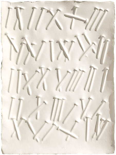 Günther Uecker Schrift der Nägel 2007 4 Prägedrucke als Vorzugsausgabe zum Buch Opus Liber je 31 x 23 cm, Aufl. 120 Ex. mit Rahmen Inv.-Nr. 2839